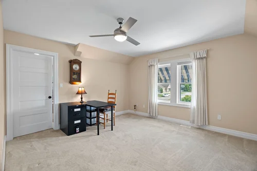 A rear den along the width of the home, at the back of the main floor, is carpeted, has nice natural light coming in from many windows and is a definite feature of the main floor. There is a walk out from the den to the rear deck area.