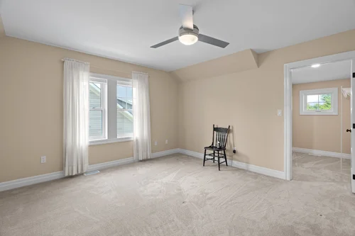 The upstairs contains two bedrooms, each with ceiling fans and hardwood flooring. A linen closet is at the top of the stairway between the two bedrooms.
